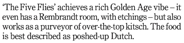 JvD One thing I always take is a crème brûlée. In one way it’s a very simple dish, but it can be ruined in hundreds of ways—and usually they are ruined. It says a lot: the differences in very simple dishes like that are very obvious. I had the worst one of my life about a month ago: the cream came from a pack with clotted sugar on top, not caramelised. And people like it, apparently. But some people are lost forever [laughter]. Potato puree can also tell a lot. But it starts with the bread: if they bring hard butter you know they just don’t have any consideration for the way we consume. Sometimes it’s even worse— you can see a layer of butter and there’s another layer under it. You can do archaeology, and see they top up the butter every time and the bottom layer is very far gone [laughter]. Once I discovered that in a very expensive restaurant which was owned by one of the big criminals connected to the one who’s now on trial. But I had to state it in the review.