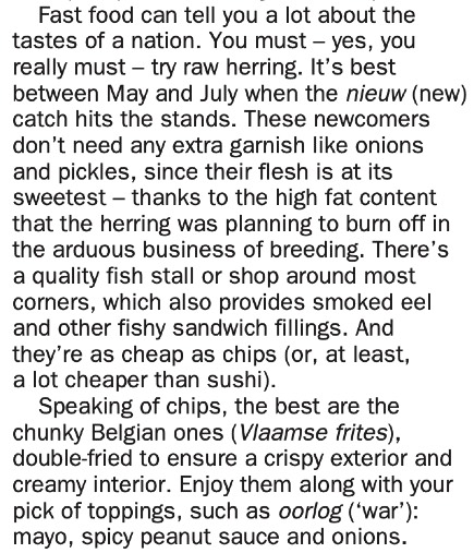 He tried to break into the guidebook market with a Virgin City Guide series covering the world’s major cities. I handled the eating section for Amsterdam, was paid well, and received an unprecedented expense account that covered the dozens of restaurants I wrote about. There was even a week when I had to do two five-course meals a day to meet the deadline. I brought a friend once or twice, but mostly I was greedy – this was my chance to learn about restaurants I could never afford.