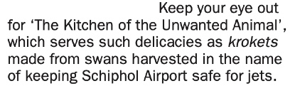 JvD I once had spoilt liver. Liver that was so far gone that it seeped through the fork. UG RRRGGGHHHHH!!!! JvD Can you imagine that? It was green. Awful. I must say the cook was fired on the day my article came out. Later, everyone thought: ‘Van Dam has such power!’ But later, I heard that the managers from the company—Krasnopolsky, a quite large company—had wanted to get rid of the cook for a year but couldn’t get permission. So they were, in fact, grateful… UG My bane is getting served vegetables from the day before. And they bullshit me that it’s fresh. JvD Happens all the time. UG And second-time hashed-up potatoes—and the idea of having to pay for it! It’s just an attitude. A lackadaisical attitude. Amsterdam restaurants need to get over that. JvD The problem is that most Dutch accept this shit. As long as there is a ribbon around it, they’ll eat shit. I have a beautiful drawing by Yrrah, the cartoonist, where, in the background there are four or five ladies eating cakes and in the foreground, there’s the cook in the kitchen and he’s decorating the cakes by squeezing a dachshund. Terrible! That’s why a lot of restaurants can go on doing that. We have a task to prevent these kinds of… UG Outrages! JvD Then there’s fried potato. What they do is put a little paprika powder in the pan and a bit of fat and just mix it up with some boiled potatoes and heat it a bit, so it looks like it’s fried but it’s not all. UG And crust is very important! JvD There is a lot of cheating in the kitchen. There are even books that tell how you how do it. I’ll fight that to the death. UG To the revolution!